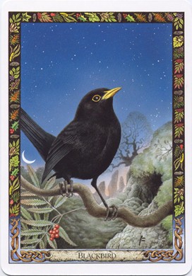 "Drawn reversed, this card reminds you that the blackbird is the smith's bird, and his song may be calling you to work in the forge of your own heart -- to create a life of passion and purpose. All four elements are used in metal-working, and to create a healthy and balanced life we must work with the power of the four elements, integrating and developing our minds and hearts, our instinct and our intuition. Just standing at the gateway between two worlds, without truly working in either, is a denial of our own power and responsibility."